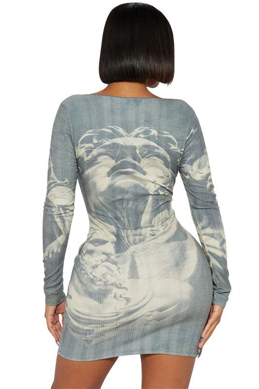 Fashion long mini dress, round neckline cut off middle, long sleeves, body-con style look